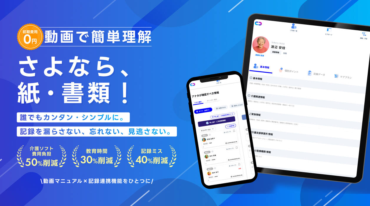 例えばケアベースの動画マニュアルなどのサポート機能を活用することで、教育にかかる時間を30%減少したケースがあります。